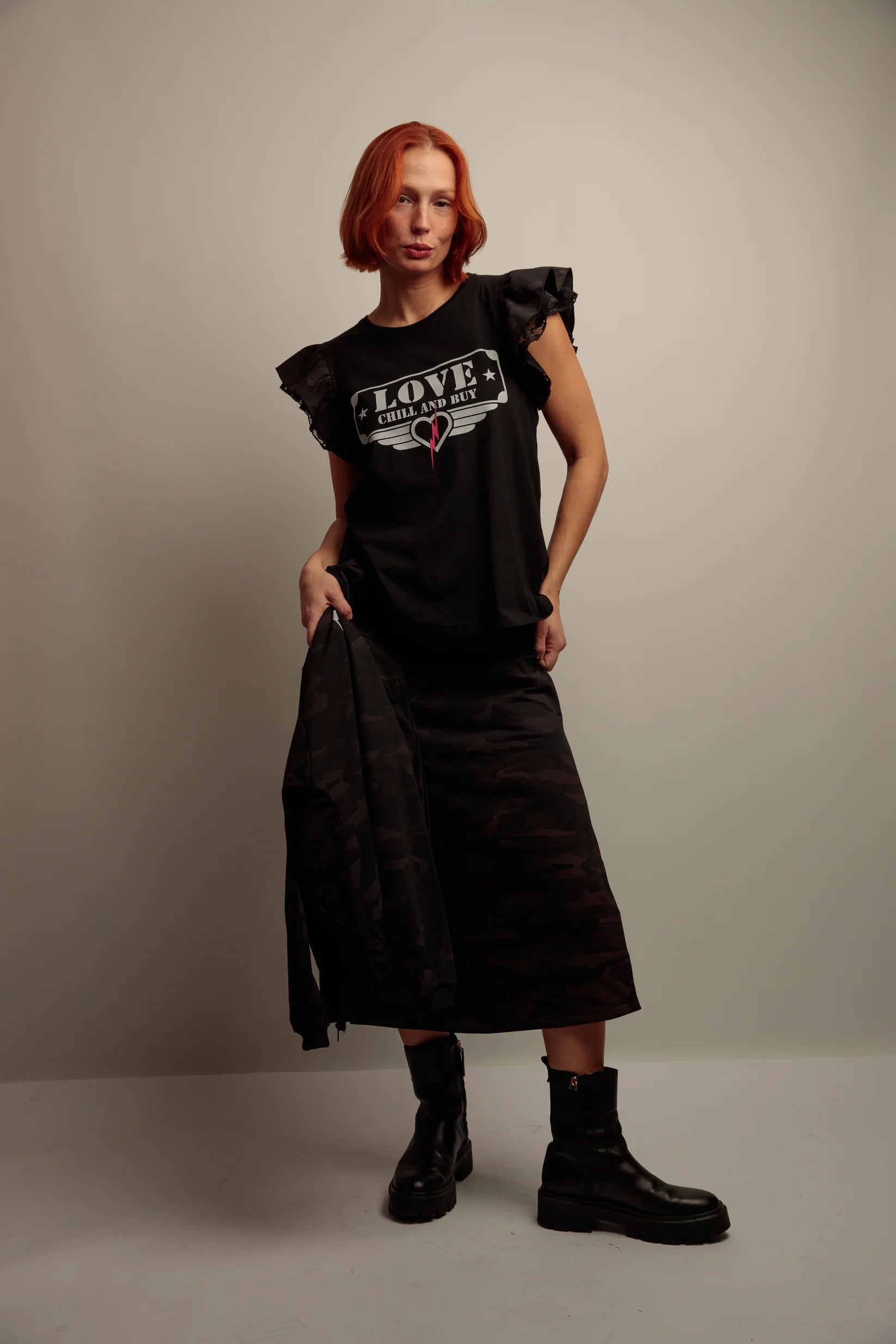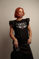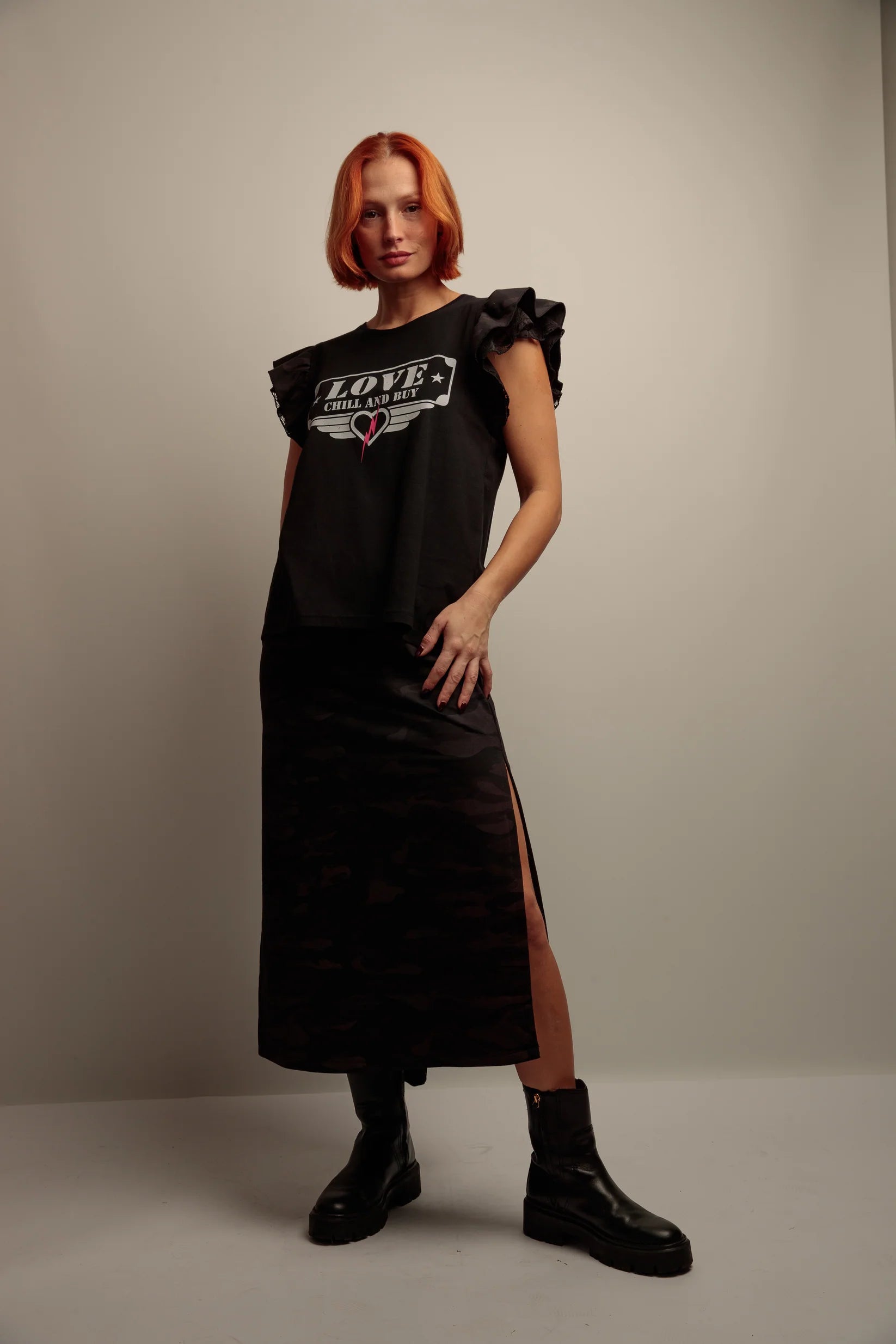 Une piece en coton qui allie confort et details visuels pour une silhouette moderne. Son col rond et sa coupe evasee se portent facilement, tandis que le bas asymetrique apporte une ligne fluide. Les epaules sont habillees de deux volants combines, alternant enc lace et tissu camouflage noir pour un contraste subtil. Lâimprime frontal renforce le caractere graphique de la piece.