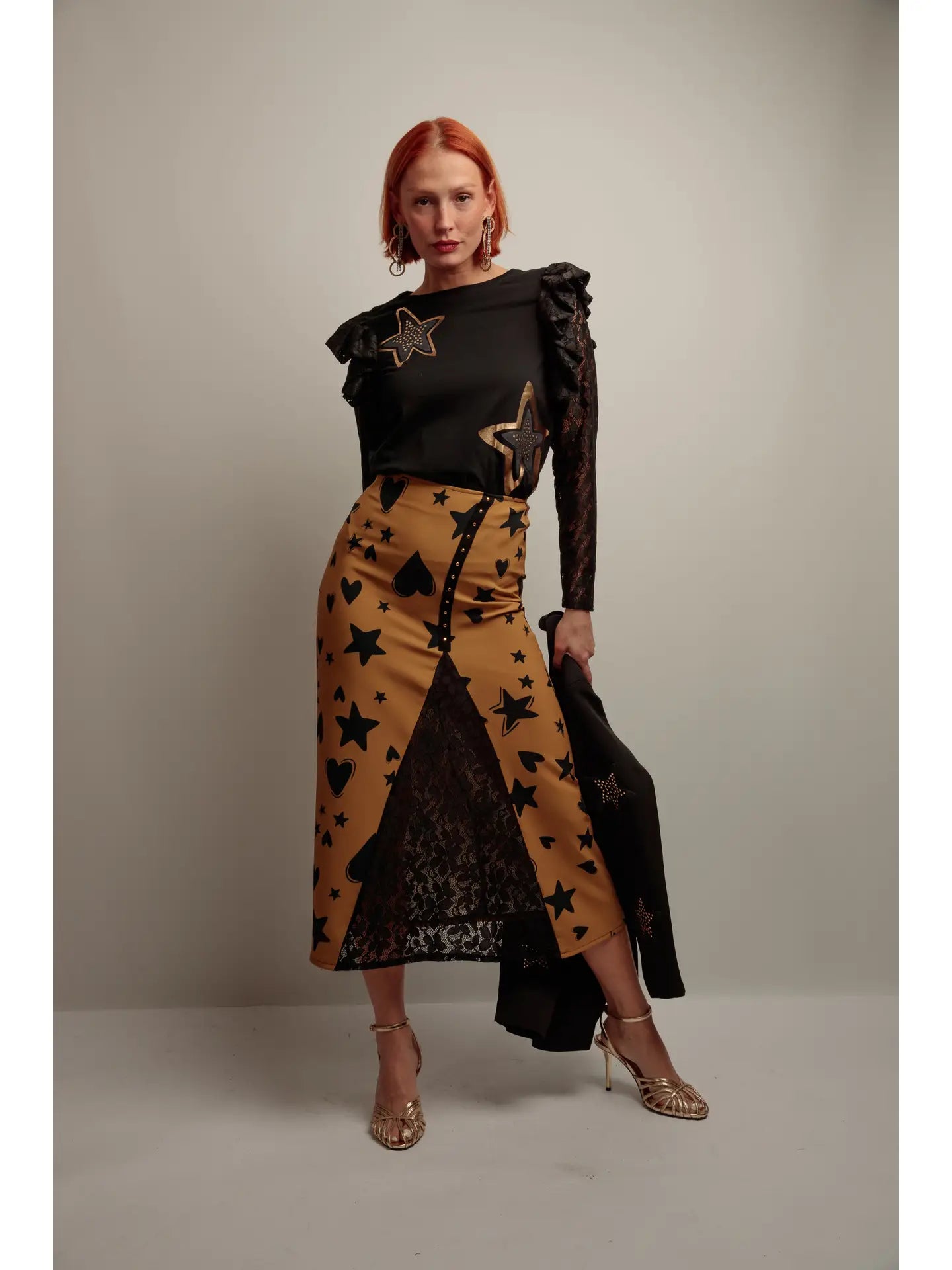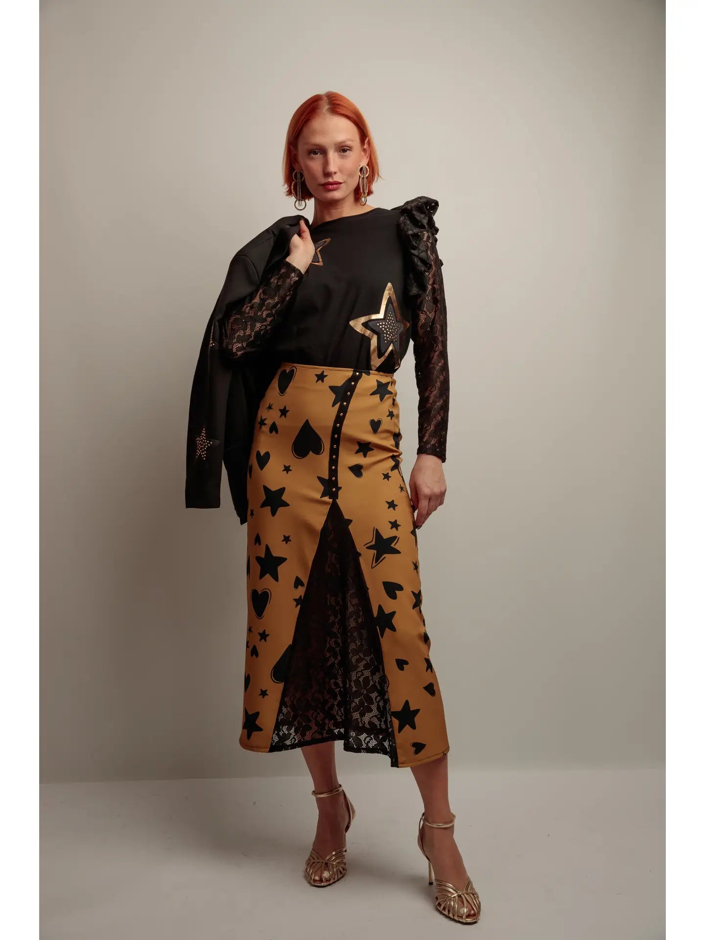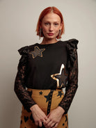 Un t-shirt noir revisité qui allie douceur du coton et jeux de transparence grâce à ses manches en dentelle. Ses écussons étoilés dorés apportent une touche graphique qui valorise la silhouette tout en restant facile à porter.