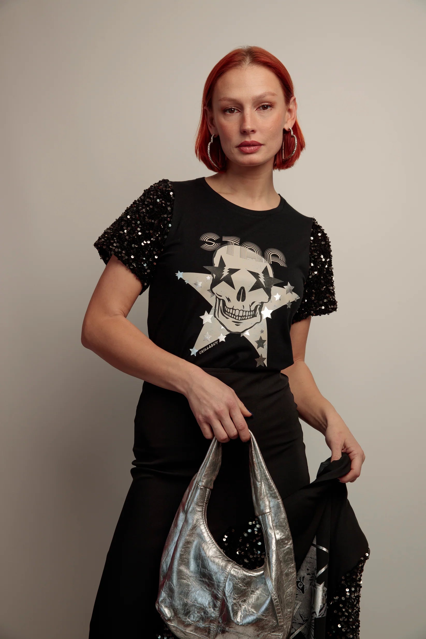 Détails marquants : motif skull frontal rehausse de touches argentees, manches pailletees