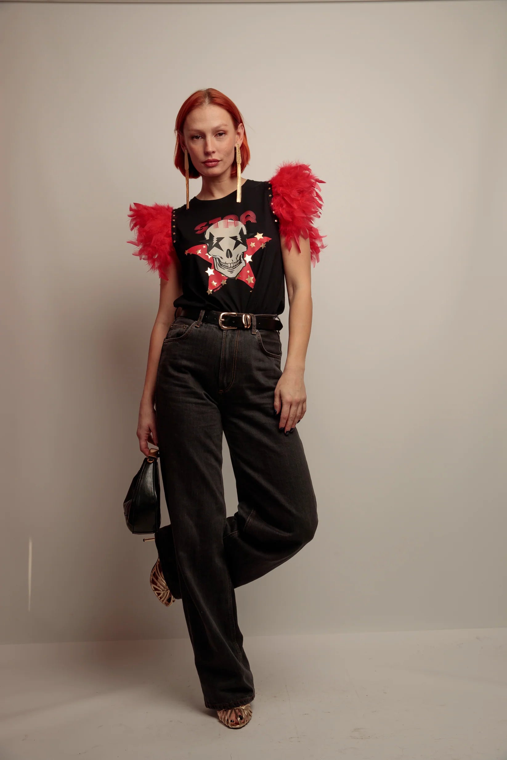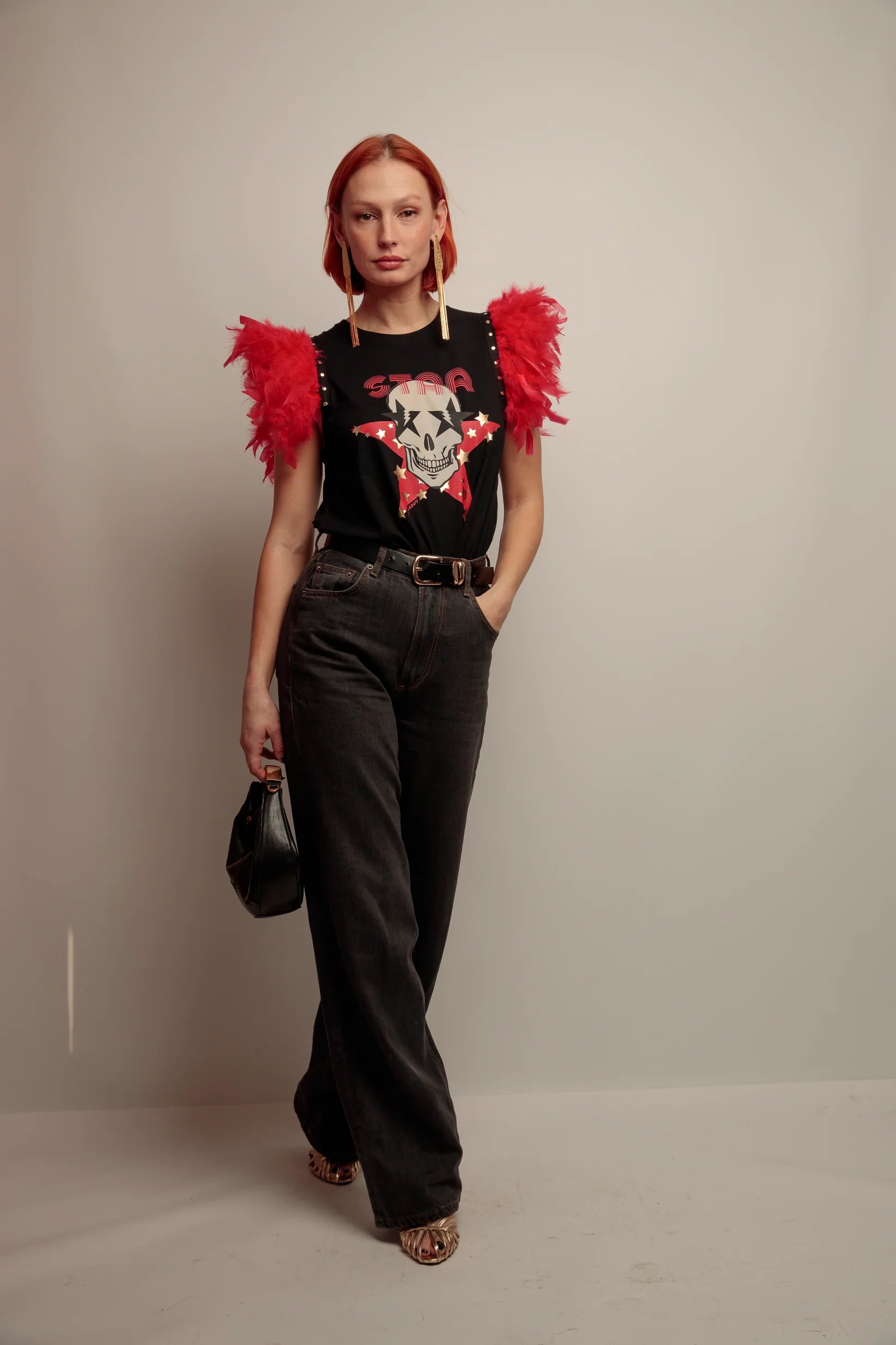 Une piece expressive qui associe coton doux, coupe evasee et jeux de textures sur l’epaule. Les plumes rouges structurees par une bande de taches dorees apportent un relief unique, tandis que le bas asymetrique assure un tombé fluide.