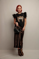 Une piece fluide qui associe coton doux, coupe evasee et un travail raffine sur l’epaule. Les plumes noires structurees par une bande de taches dorees apportent relief et presence, tandis que le bas asymetrique assure un tombé naturel.