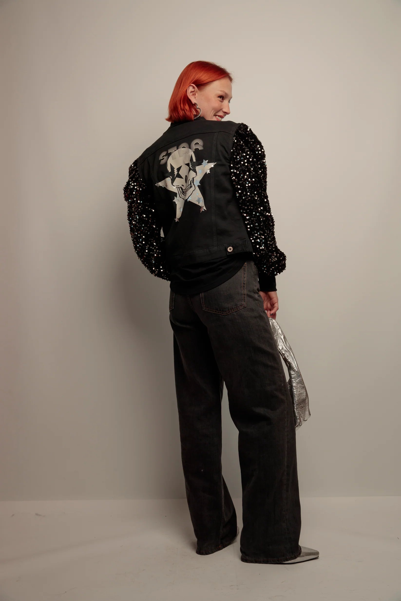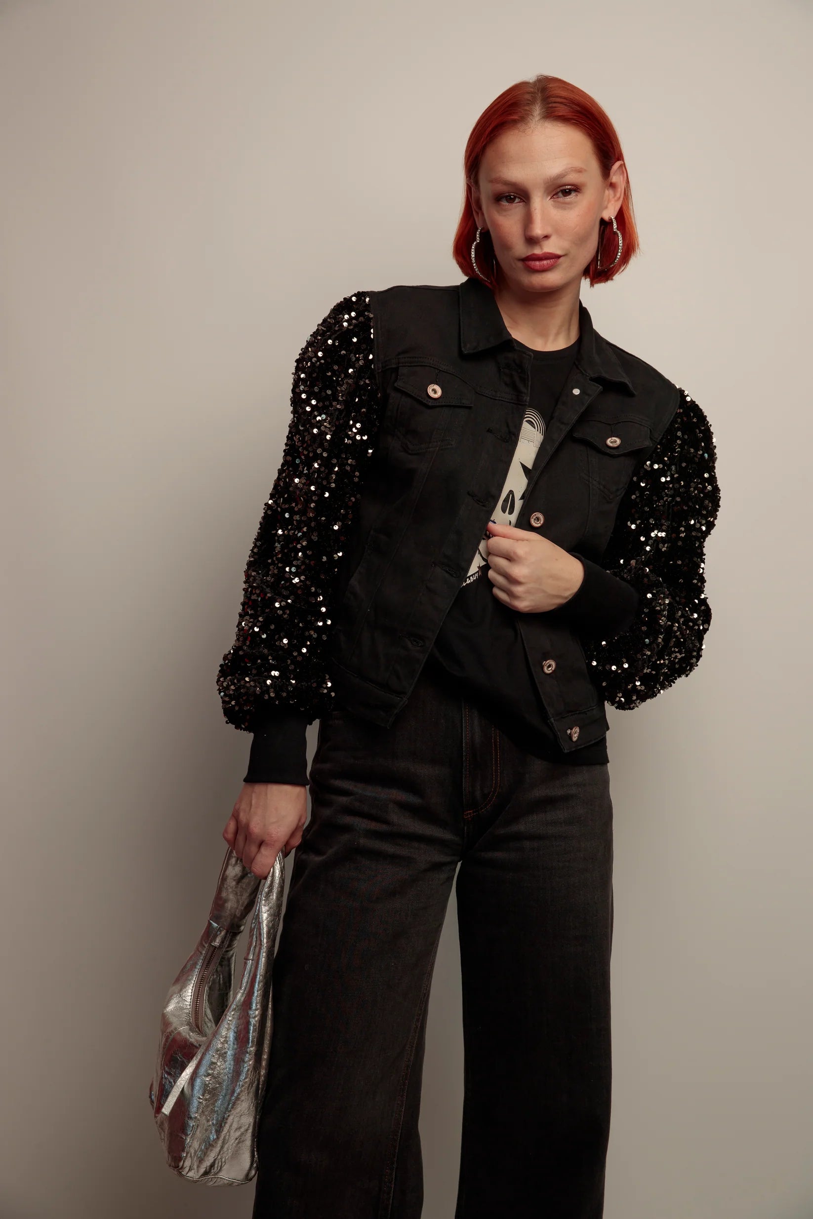 Une veste denim courte qui combine l’allure du jean noir avec l’eclat de manches pailletees. Sa coupe moderne et sa finition metallisee au dos en font une piece forte, facile a integrer dans vos looks du quotidien.