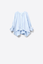 Lightweight, flowing, and decidedly feminine, this baby blue striped blouse brings a fresh, soft touch to any outfit. Its loose fit and romantic details make it easy to wear and style.