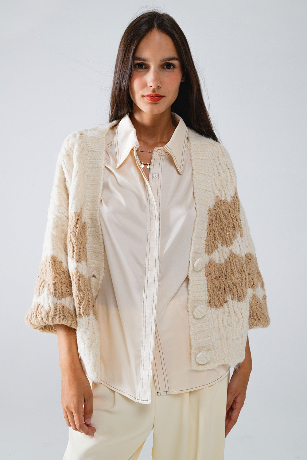 Gorgeous super chunky knit cardigan with a V-neck and button placket. Cream with 2 camel stripes and multi-colored sequin details on the sleeves. Pair it with jeans or a denim skirt for a beautiful fall look.