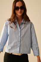 Discover the perfect blend of style and comfort with this blue poplin cropped shirt. Crafted from premium breathable fabric, it guarantees all-day comfort. The wide cuffs, accented with trendy stripes, add a contemporary touch to your outfit, making it an ideal choice for any occasion.