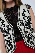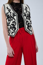 Length: Cropped length. Subcategory: Sleeveless jacket. Collar: V-neck. Sleeve: Sleeveless style. Print: Abstract pattern. Fit: Relaxed fit. Style: Romantic style. Runs true to size. S.
