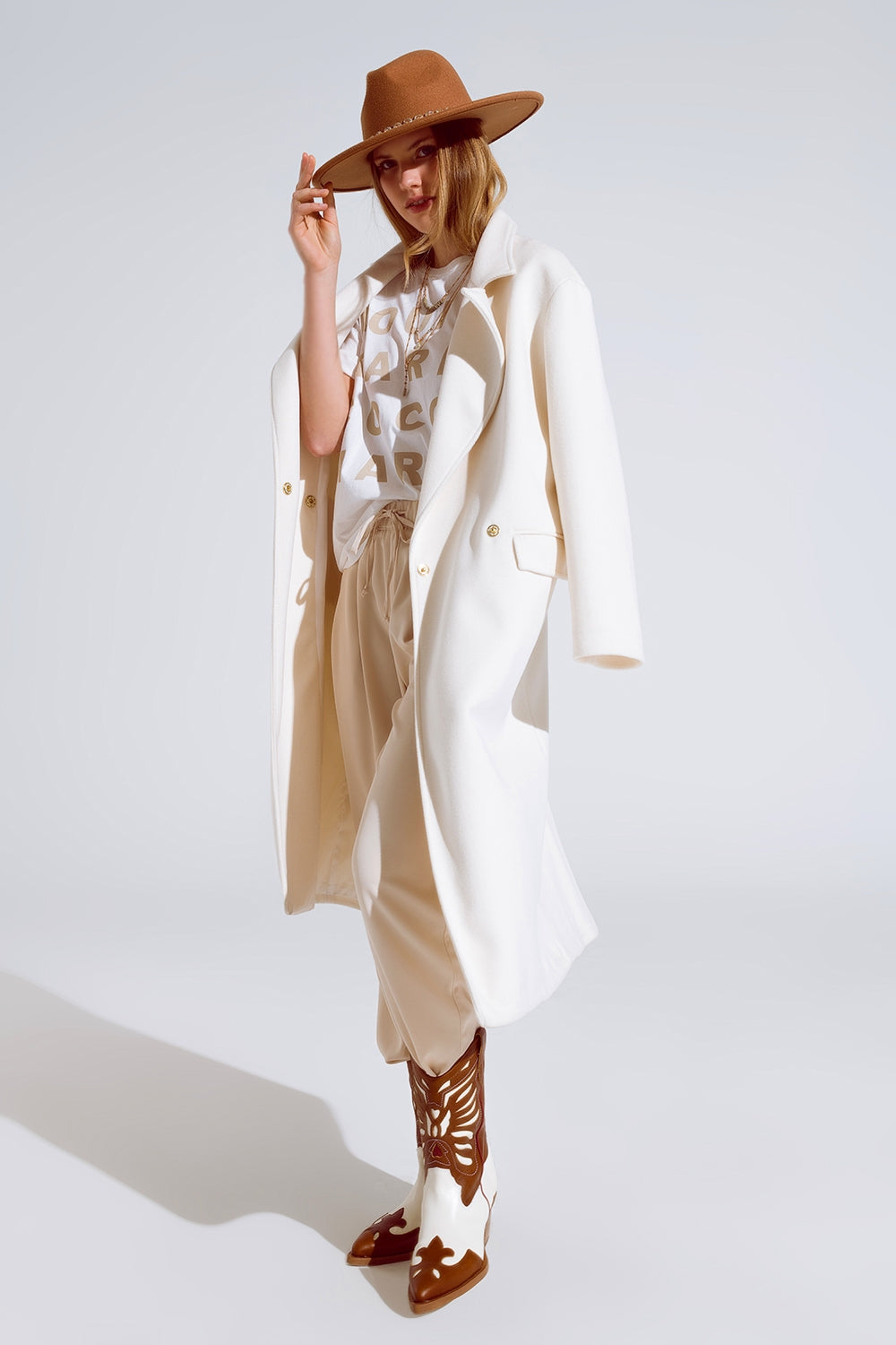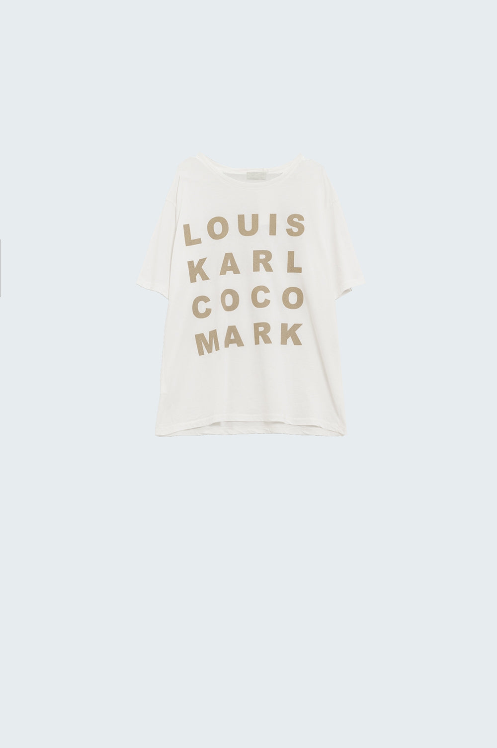 Cream T-shirt with famous name logos on the front