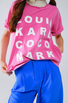 Fuchsia T-shirt with famous name logos on the front