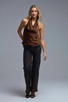 Sublimez vos tenues de soirée avec ce top dos nu en satin marron, pensé pour offrir fluidité et éclat subtil. Son encolure drapée encadre délicatement le haut du buste tandis que l’empiècement en dentelle apporte un contraste raffiné.
