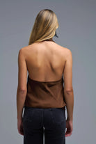 Top dos nu satin marron encolure drapee – dentelle delicate