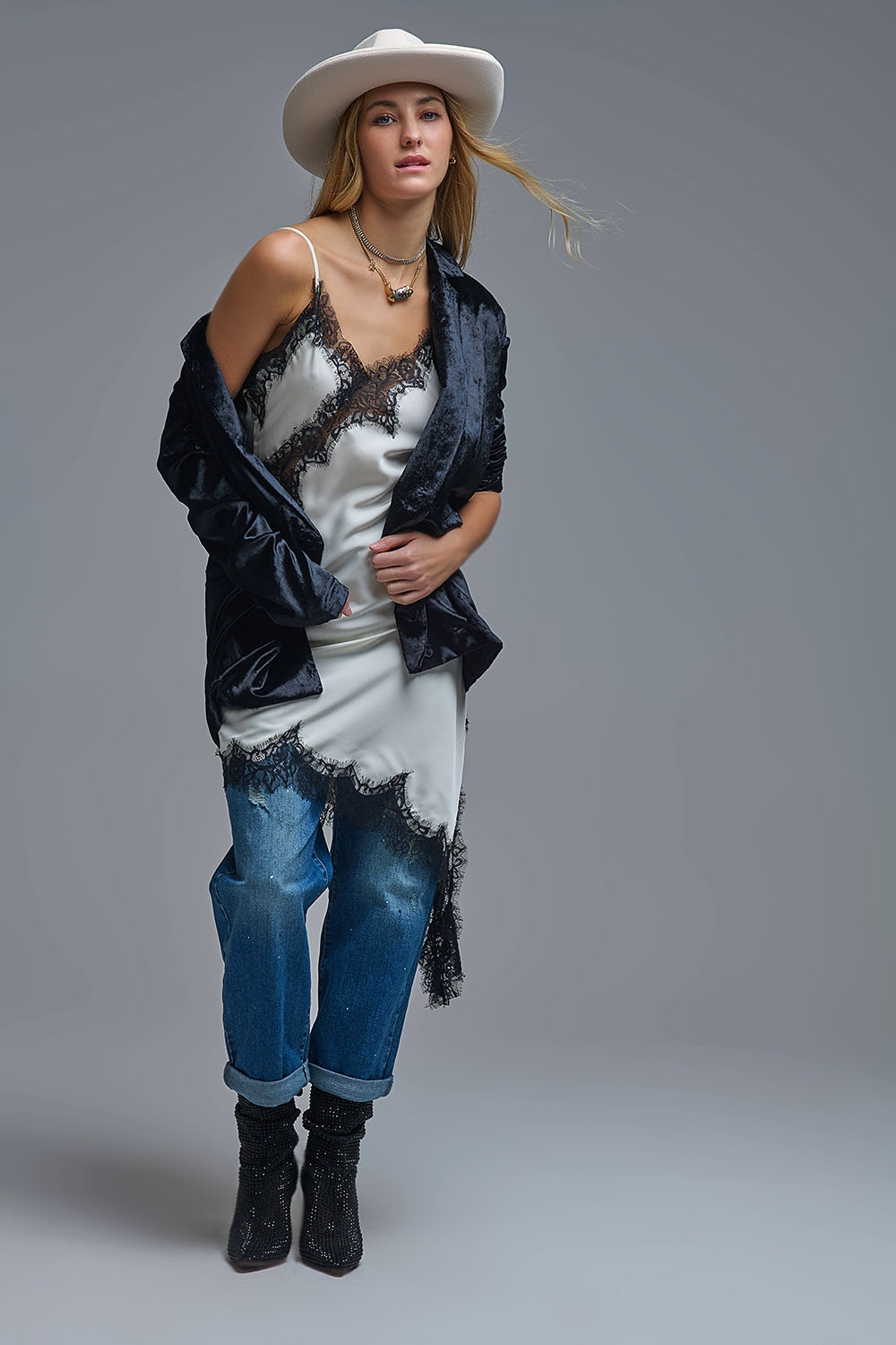 Élégante robe asymétrique en satin blanc et dentelle