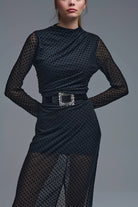 Mettez en valeur votre silhouette avec cette robe midi noire transparente à pois, pensée pour offrir légèreté et élégance. Son tissu aérien et sa coupe ajustée créent une ligne flatteuse idéale pour vos occasions spéciales.
