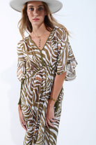 Robe longue fluide en mousseline de soie imprimé zèbre kaki avec cordon de serrage à la taille