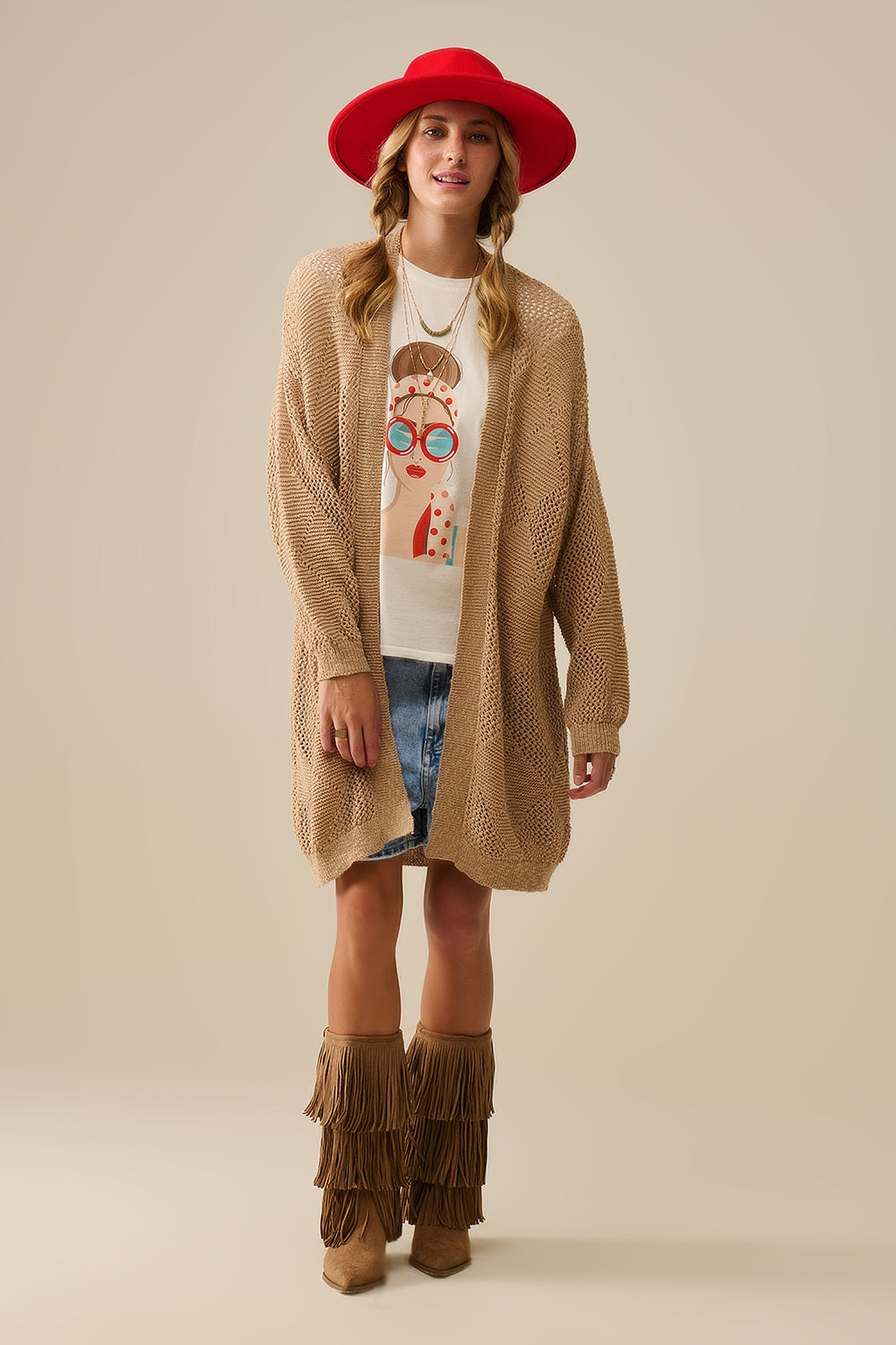 Warm up your outfits in style with this camel cardigan with a draped silhouette. Its delicate crochet trim and argyle knit pattern add a rich texture that transforms a staple piece into a bohemian essential.