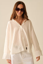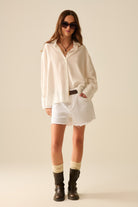 Combine comfort and style with this oversized white shirt, enhanced by an elegant bow at the back. Lightweight and flowing, it adapts to all your desires with a subtle touch of originality.