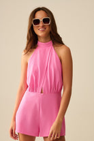 Brighten up your day with this pink jumpsuit featuring a bold design and flattering cut. Featuring an elegant high neck, structured front pleats, and flared shorts, this sleeveless piece strikes the perfect balance between sophistication and summer cool.