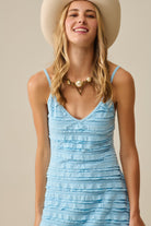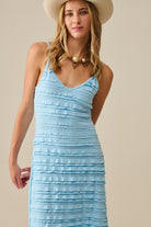 Lightweight and flattering, this light blue strappy maxi dress is perfect for sunny days. Its horizontal ruffled texture and V-neckline subtly enhance the silhouette while offering absolute comfort.