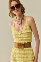 Brighten up your summer days with this yellow maxi dress featuring delicate ruffles. Its flattering V-neckline, thin straps, and dynamic texture create a feminine and airy silhouette, perfect for all your summer occasions.
