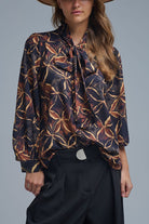 Chemise en mousseline de soie noire à imprimé abstrait et nœud papillon