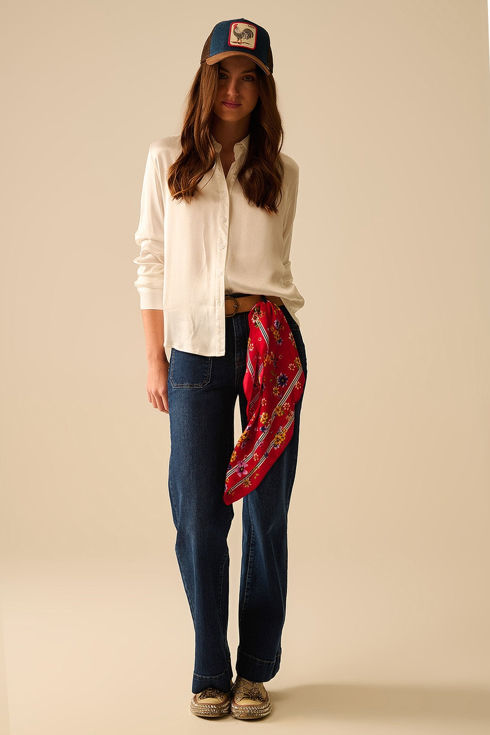 Chemisier en satin à manches longues avec col polo de couleur blanche