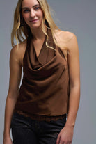 Top dos nu en satin marron avec encolure drapée