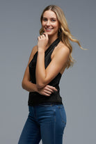 Top dos nu en satin noir avec encolure drapée