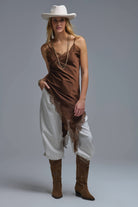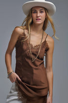 Robe asymétrique en satin et dentelle marron