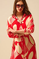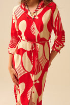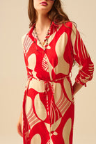 🔹 Détails marquants : Col polo structuré, imprimé abstrait rouge vibrant, ceinture à nouer ton sur ton, fermeture boutonnée sur toute la longueur