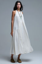 Robe longue à col licou et coutures apparentes en crème
