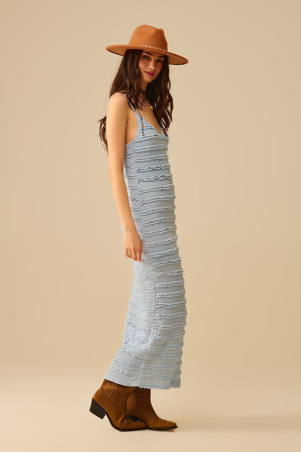 Robe longue à volants et fente en bleu