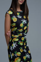Robe longue en tulle noir avec volant sur le côté en imprimé jaune citron