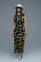 🔹 Détails marquants : Volant imprimé jaune sur le côté, encolure ras du cou, sans manches, longueur maxi