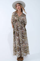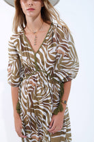 Robe longue fluide en mousseline de soie imprimé zèbre kaki avec cordon de serrage à la taille