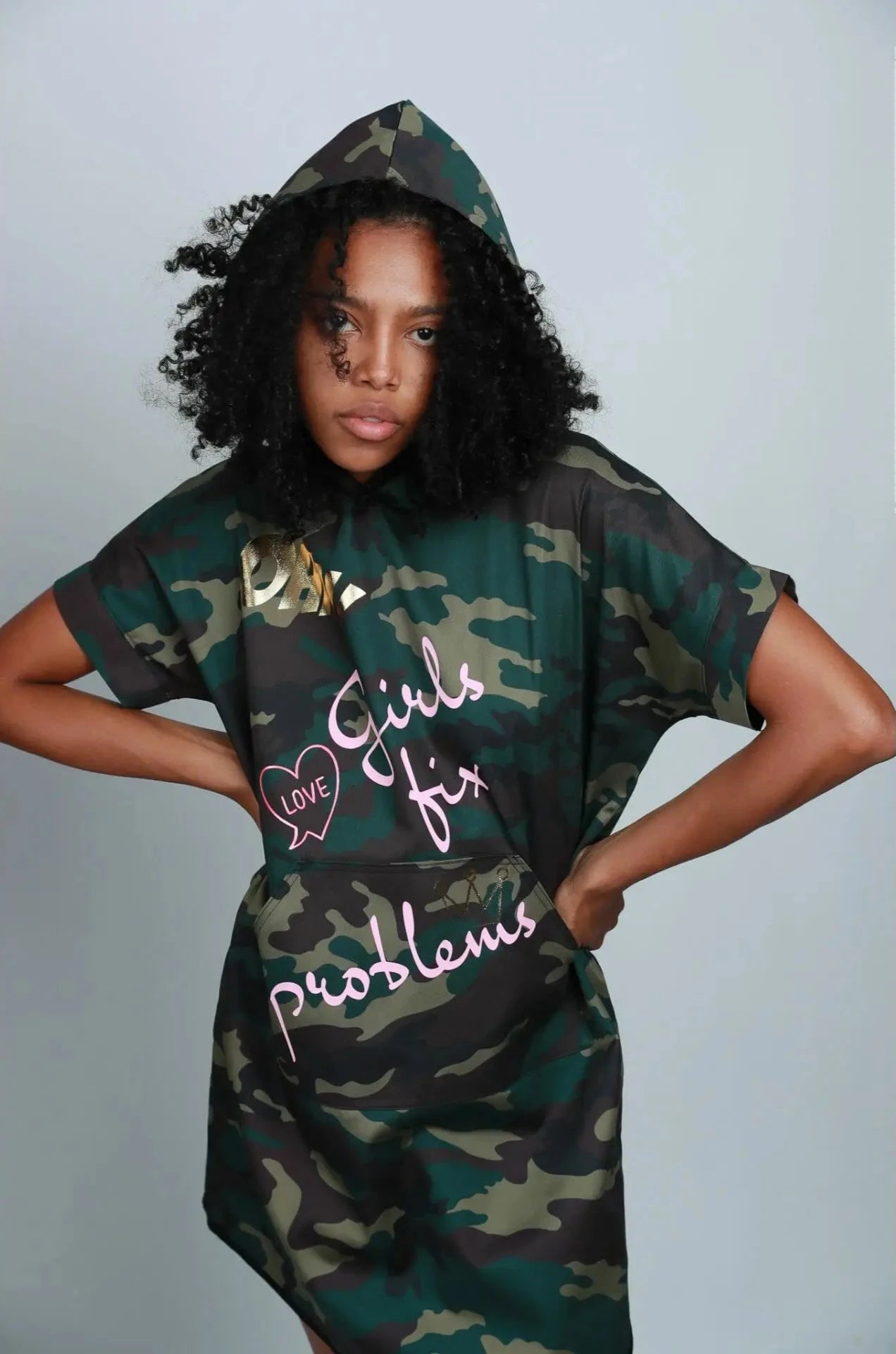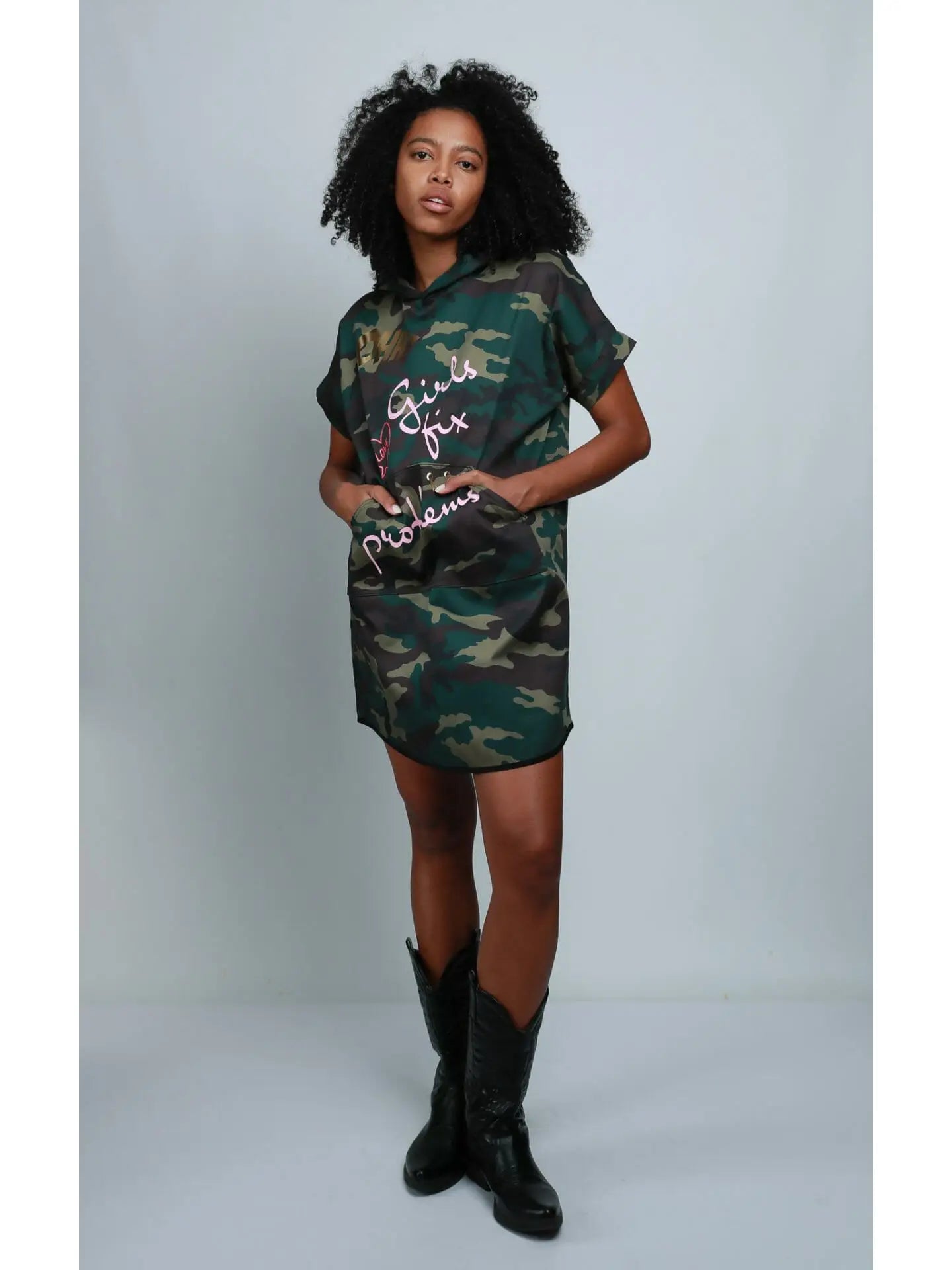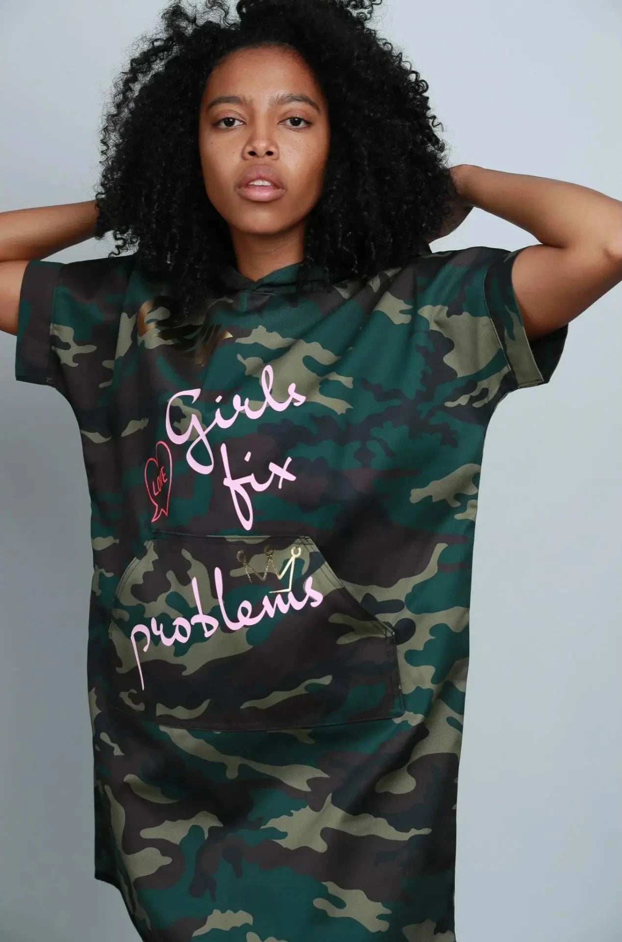 Affichez votre force tranquille avec cette robe à capuche à imprimé camouflage. Sa coupe décontractée et son inscription audacieuse « Girls Fix Problems » en font une pièce qui conjugue confort, style et message fort.