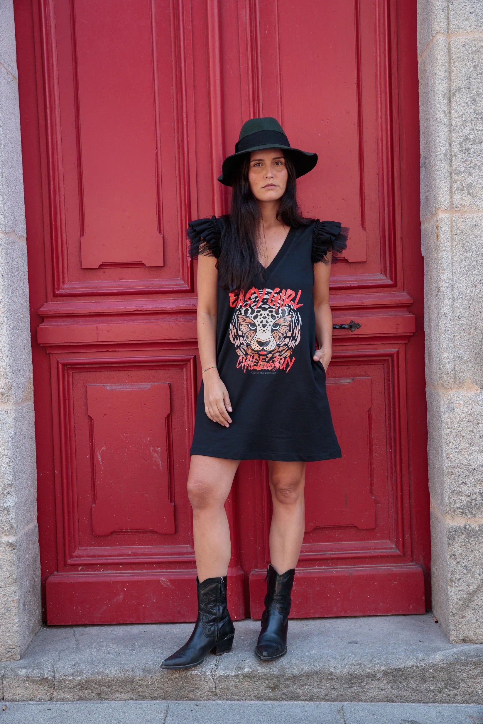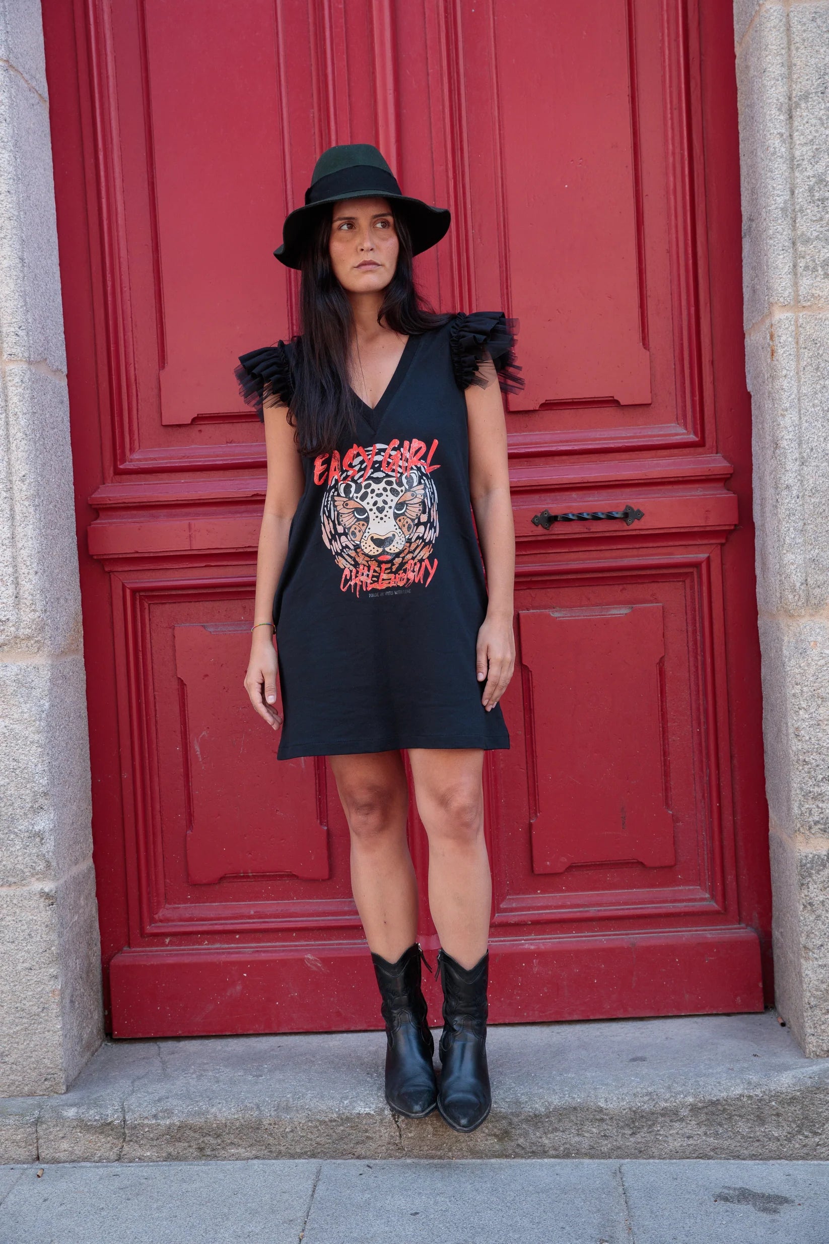 Affichez un style audacieux avec cette robe courte noire en coton, au design aussi confortable que percutant. Son encolure en V, ses manches à volants en tulle superposés et son imprimé tigre en font une pièce forte, idéale pour affirmer votre personnalité avec originalité.