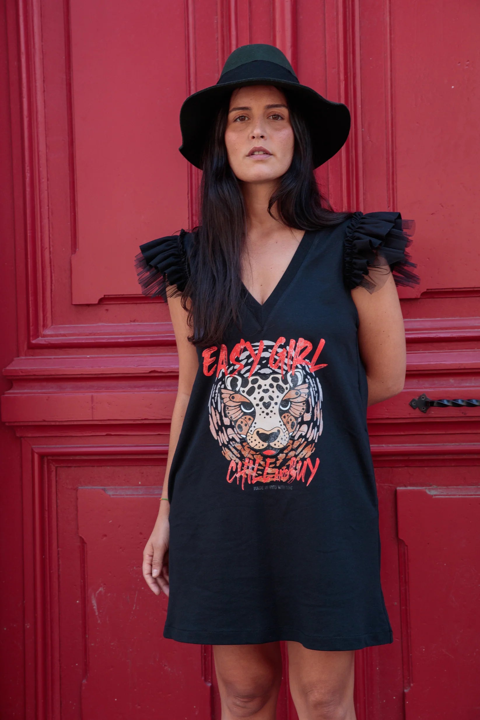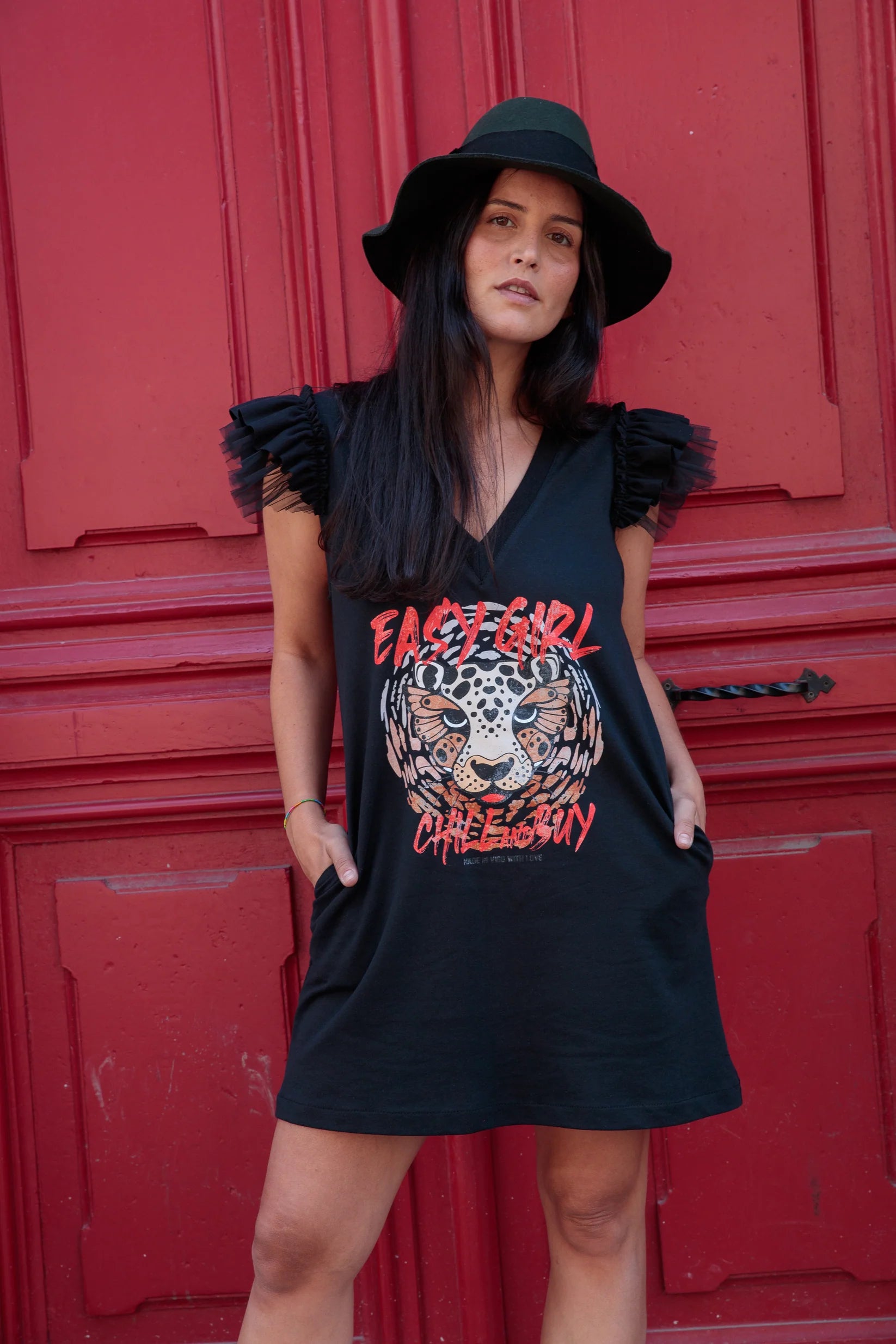🔹 Détails marquants : Encolure en V prononcée, manches courtes à volants en tulle en couches, poches latérales pratiques, imprimé tigre rouge et terre avec détails métallisés, messages "Easy Girl" et "CHILL&BUY"