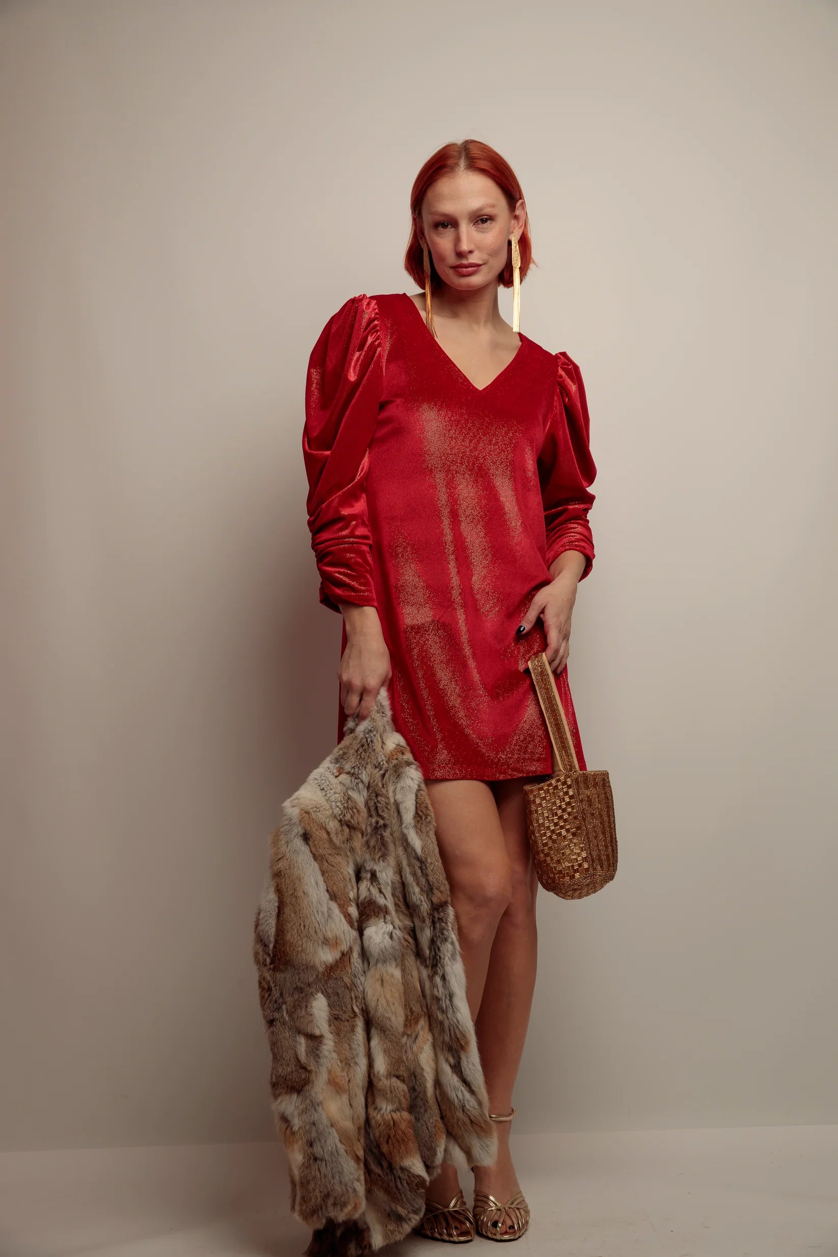 Cette robe courte en velours rouge illumine la silhouette grâce à sa finition satinée et ses micro-étincelles dorées. Son col en V et ses manches longues bouffantes apportent une allure moderne et féminine, parfaite pour rayonner sans en faire trop.