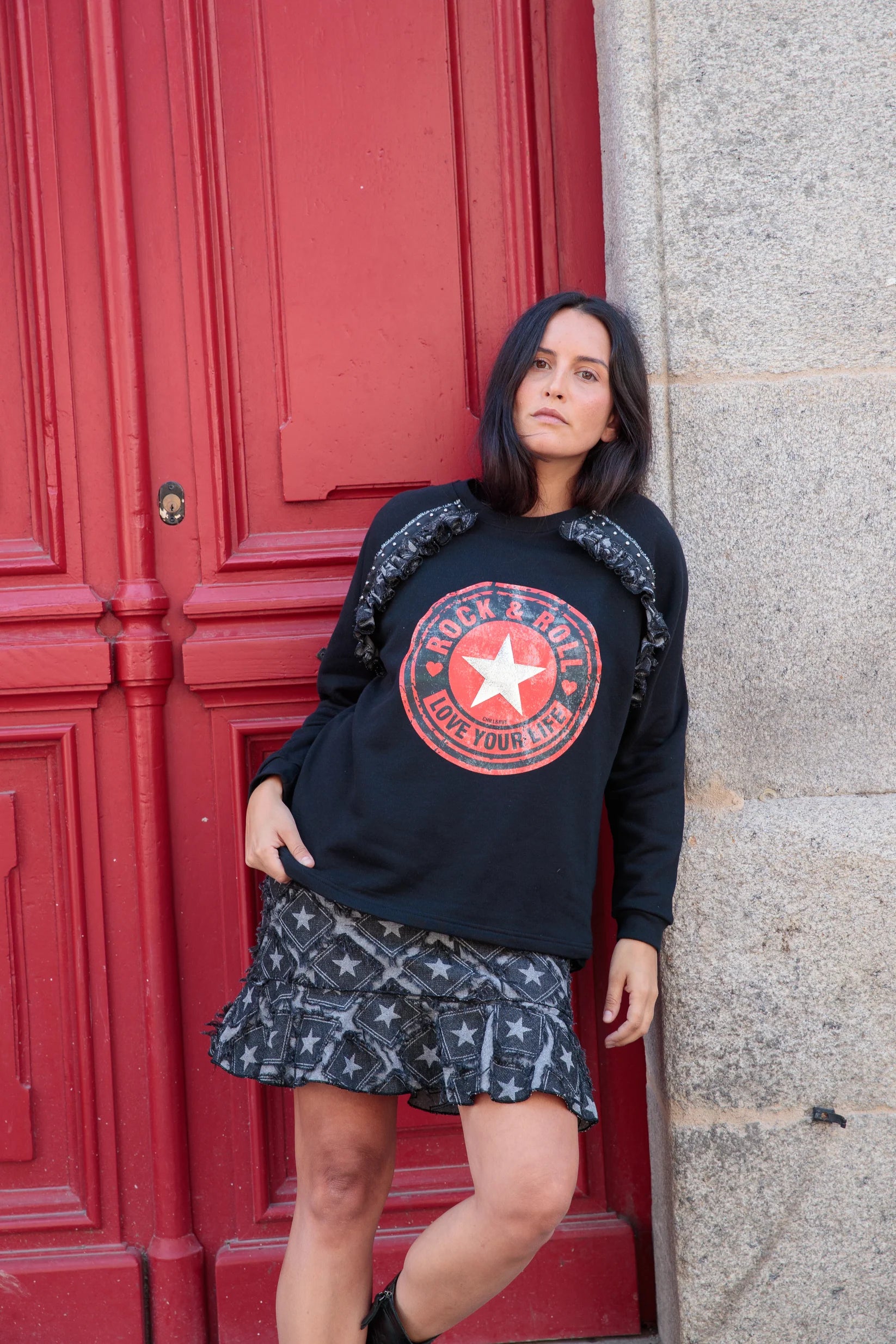 🔹 Détails marquants : Imprimé central "Rock & Roll - Love your life" rouge, blanc et argenté effet usé, étoile métallique en feuille argentée, mini volants en denim noir imprimé étoilé, clous argentés sur les manches