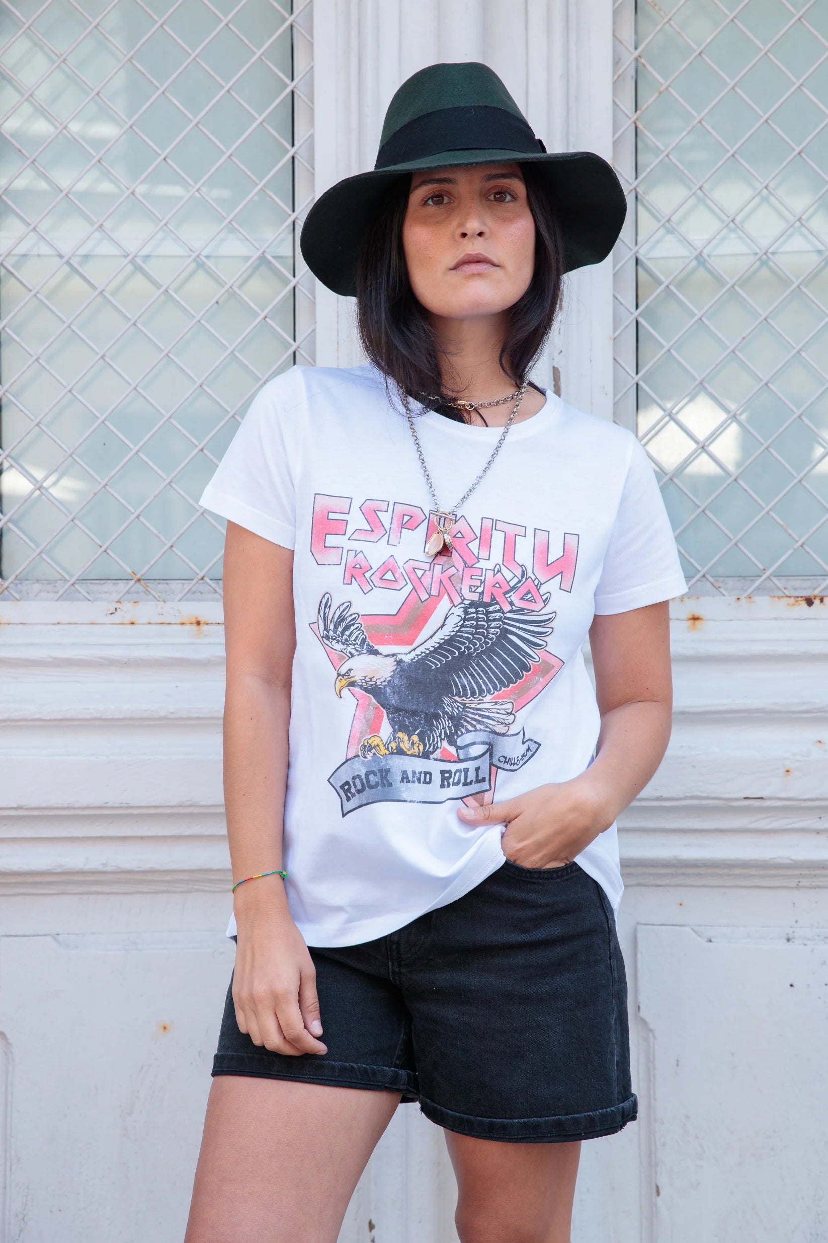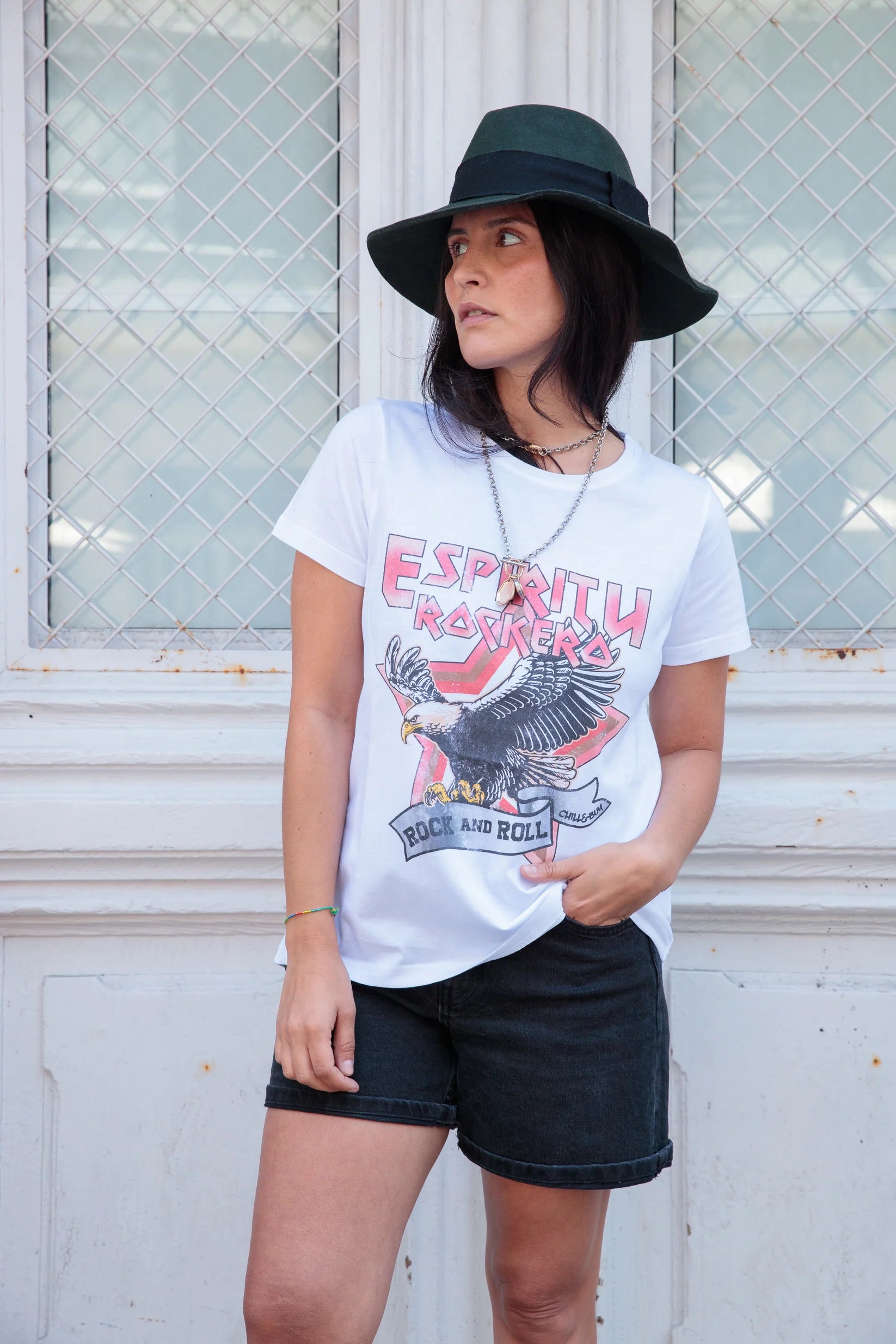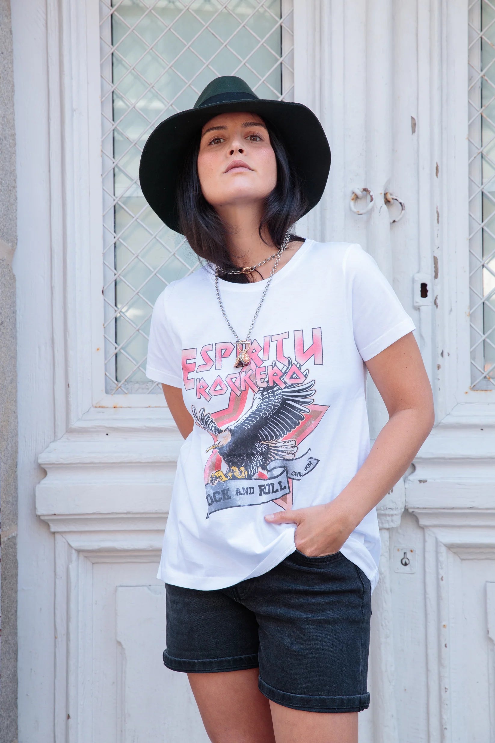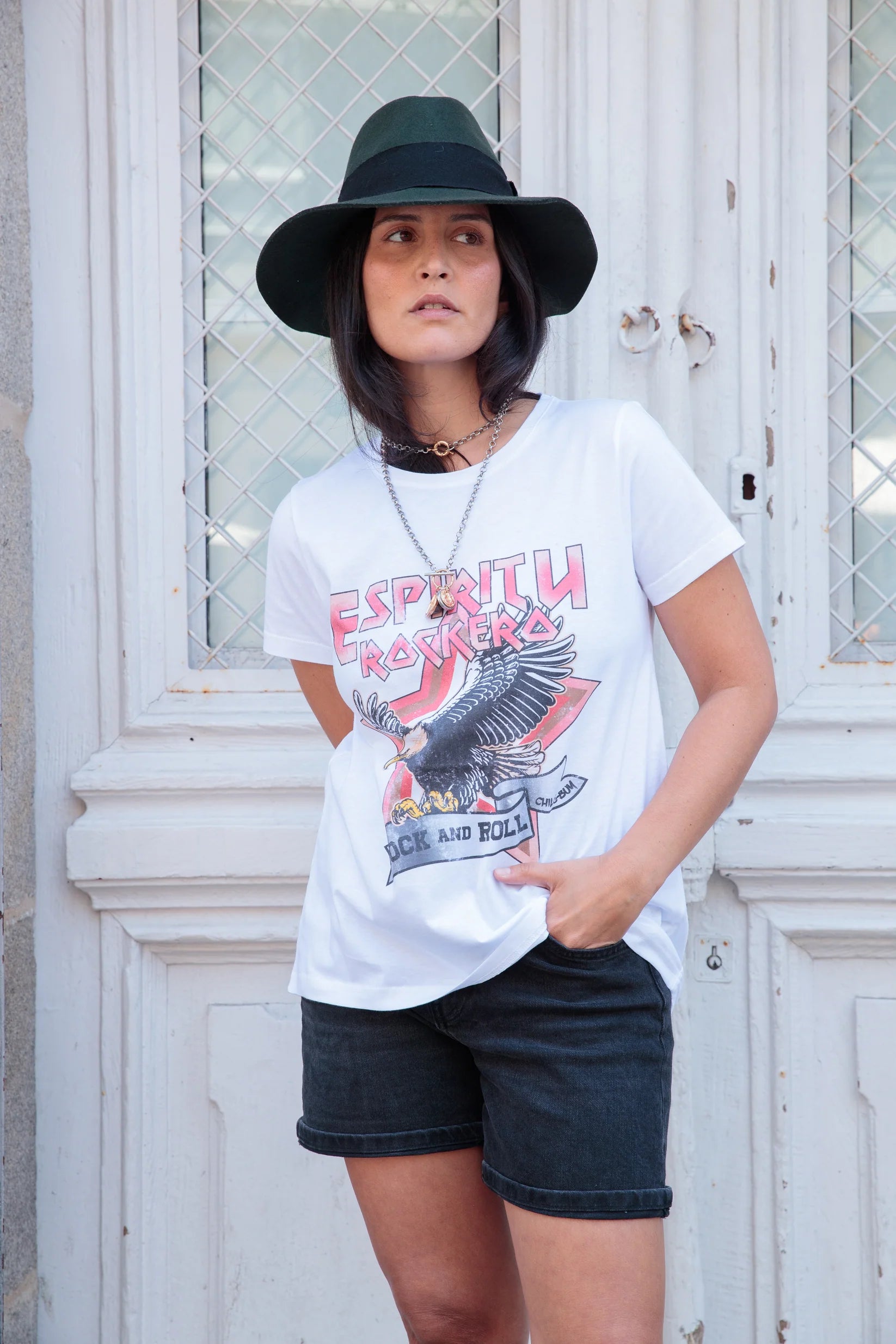 🔹 Détails marquants : Col rond, manches courtes, design frontal à motif aigle (inspiration rock et liberté)
