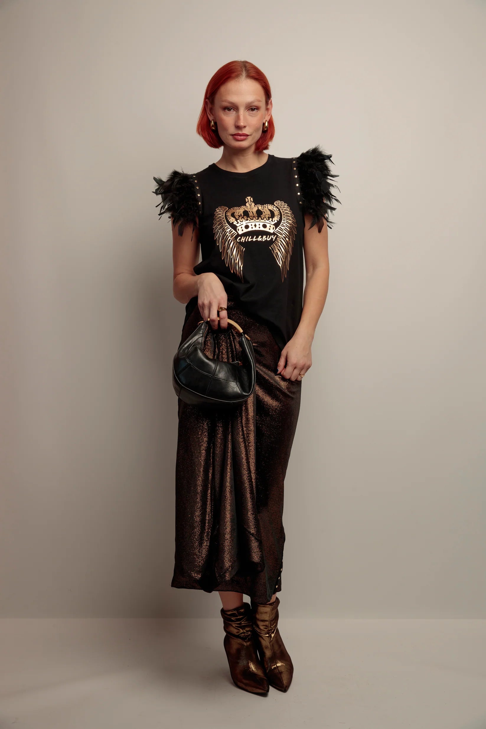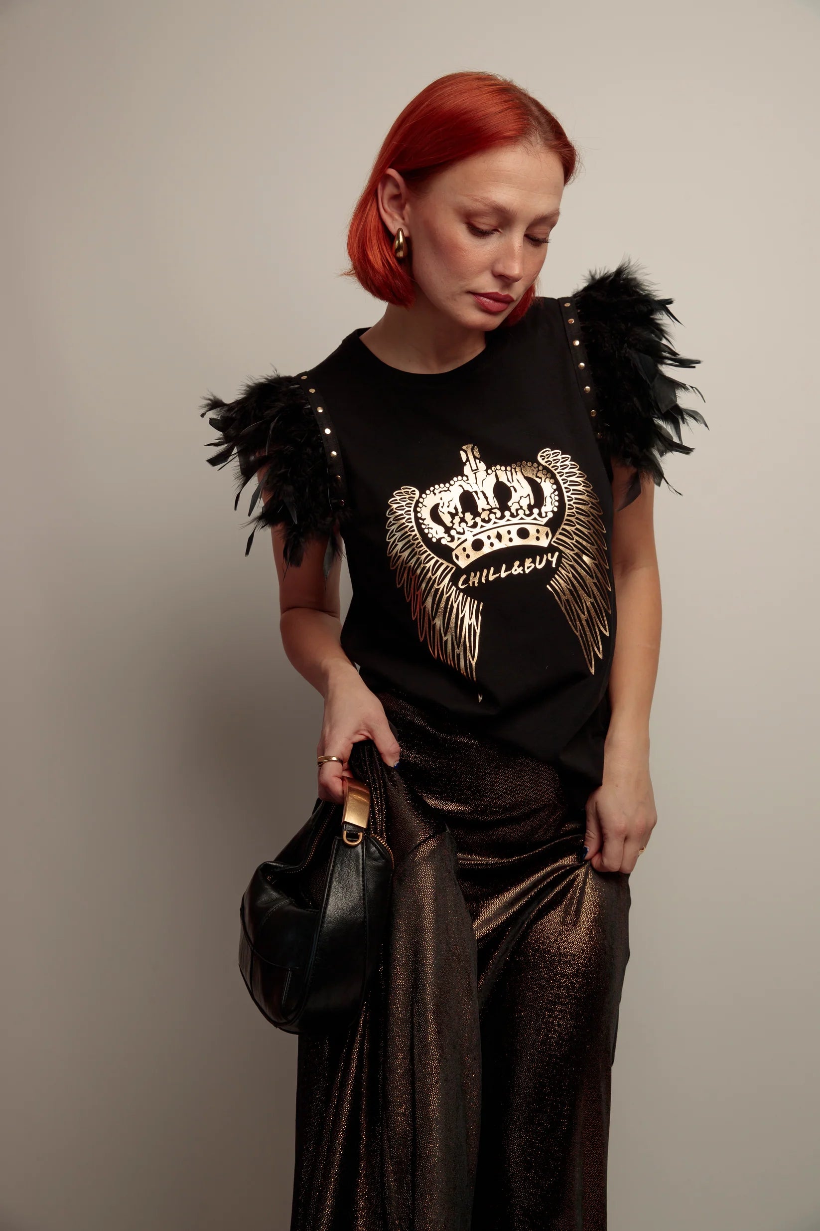 Le t-shirt Plumes Ailes Crown se distingue par ses finitions travaillées et son imprimé doré lumineux. Une pièce forte et facile à associer, idéale pour apporter du caractère à une silhouette du quotidien tout en restant confortable.
