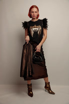 🔹 Détails marquants : Détail de plumes noires à l’épaule, bande de clous métalliques dorés, imprimé frontal avec finitions dorées