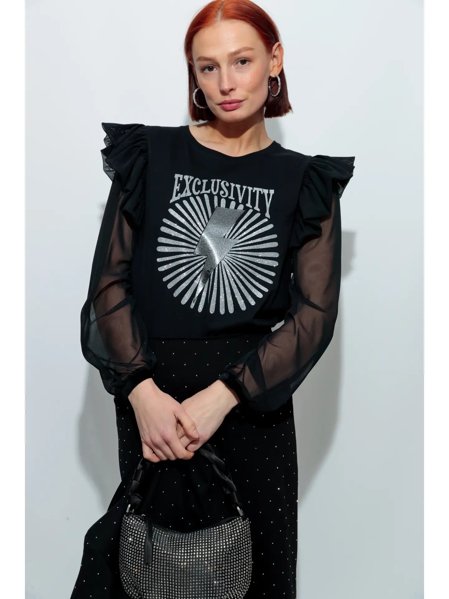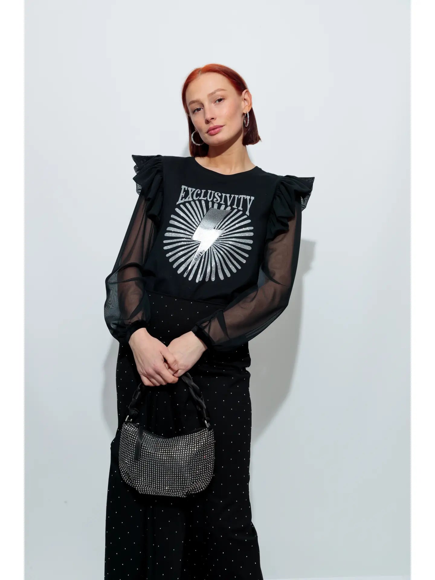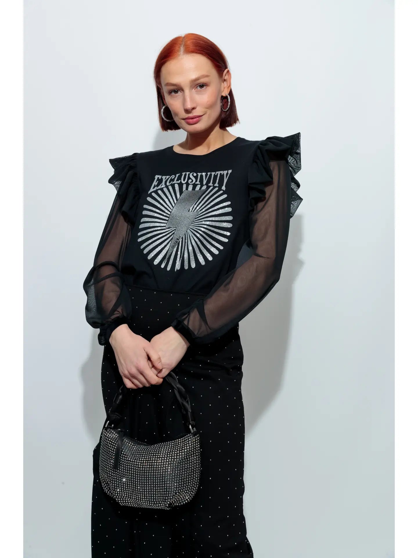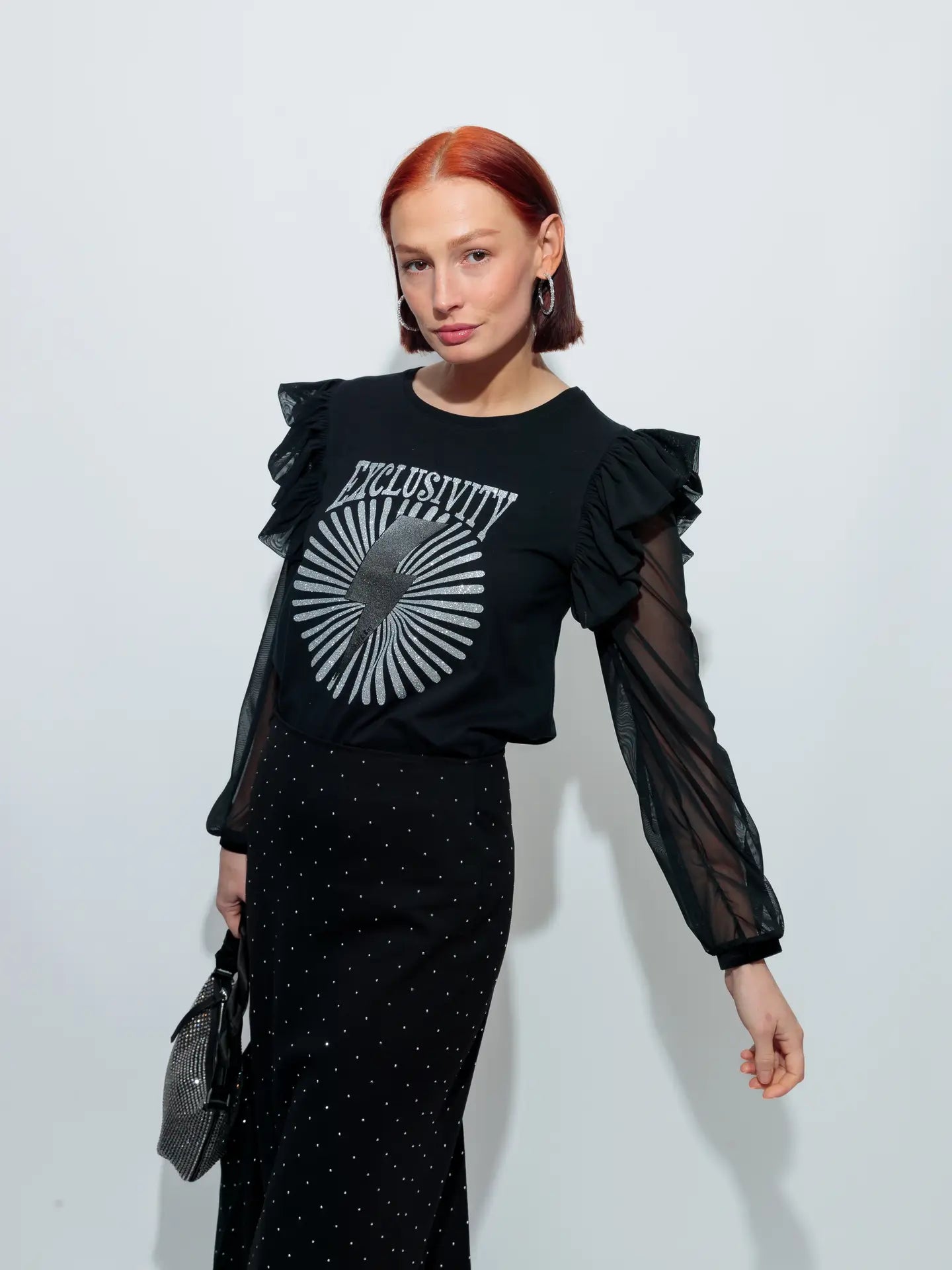 🔹 Détails marquants : manches bouffantes en tulle léger, volants aux épaules, poignets en velours noir raffiné, inscription frontale argentée Exclusivity