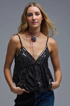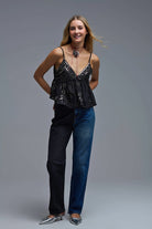 Illuminez vos tenues avec ce top noir à paillettes, sublimé par des ornements floraux qui ajoutent relief et finesse. Sa matière légère façon mousseline crée un tombé fluide qui accompagne élégamment chaque mouvement.