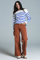 Pull blanc avec des boutons sur les épaules et des rayures bleues