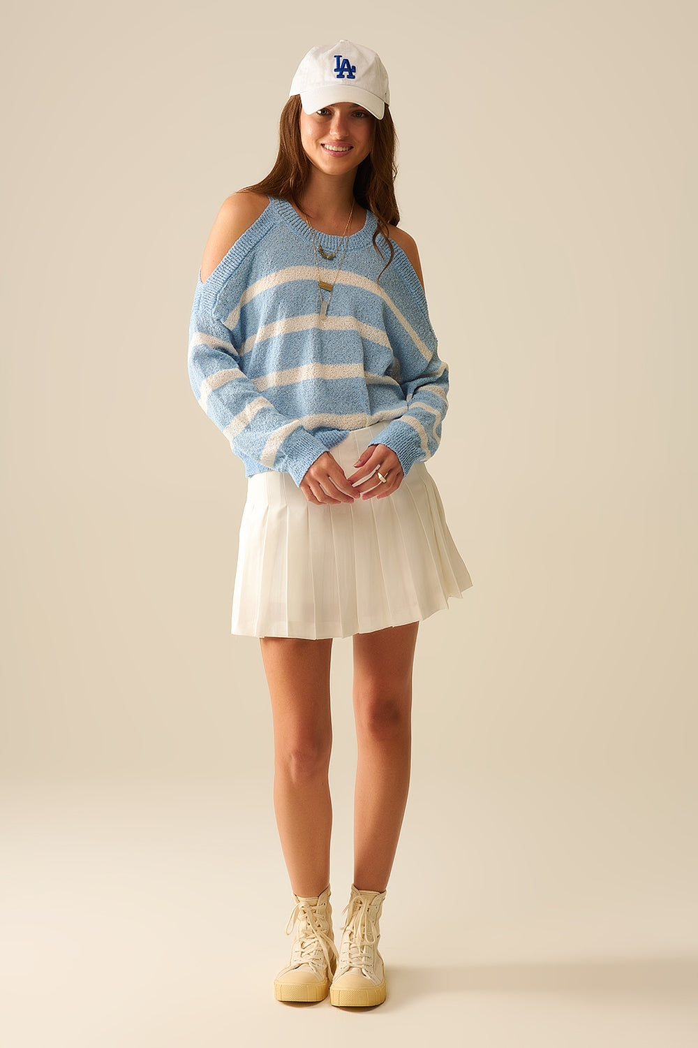 Pull Heather avec épaules ouvertes et rayures horizontales en bleu
