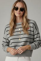 pull-over en tricot rayé gris avec détails en forme de cœur rouge