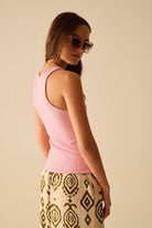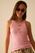T-shirt rose sans manches en tricot de coton extensible côtelé