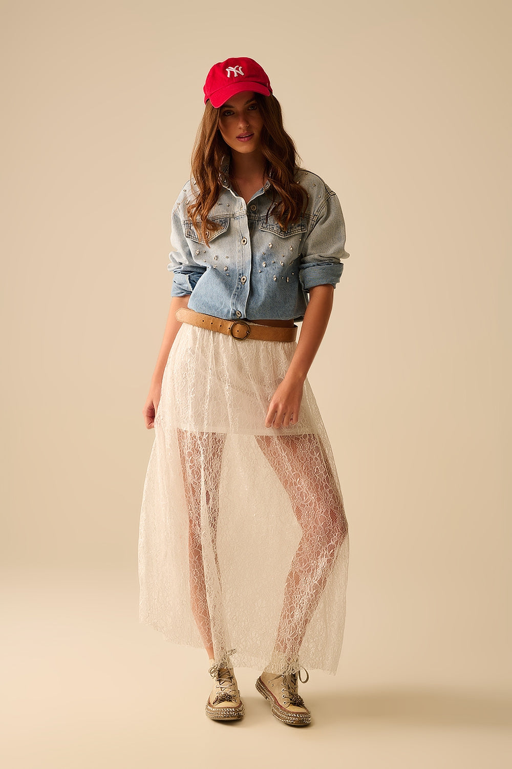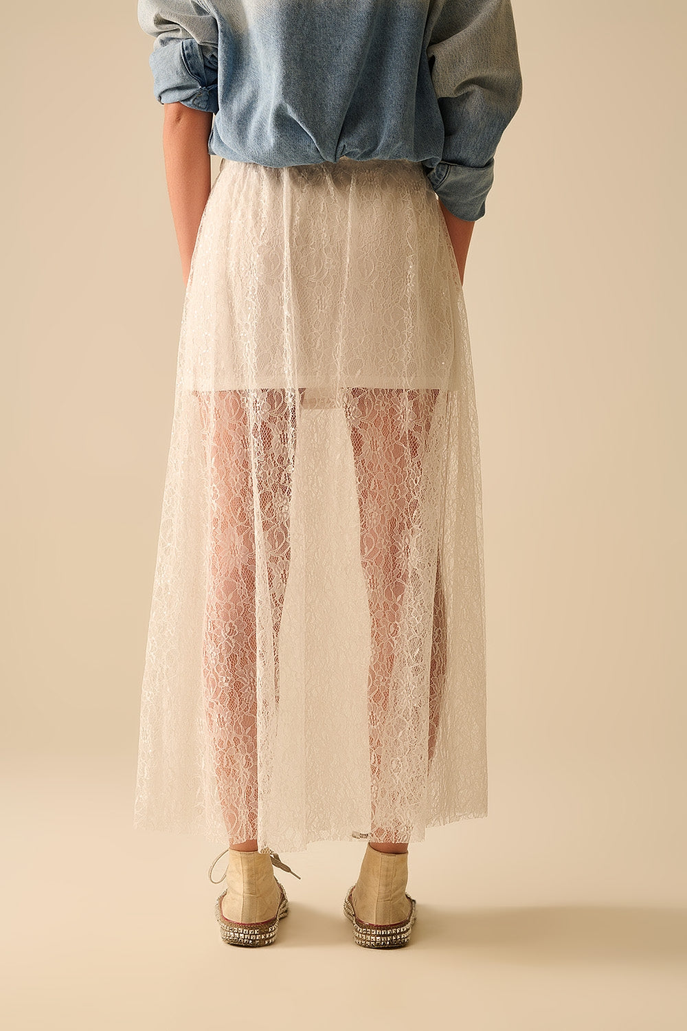 Jupe maxi en dentelle blanche avec détails en paillettes