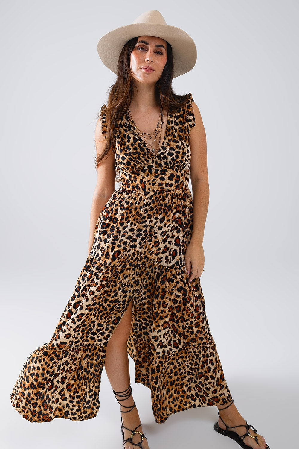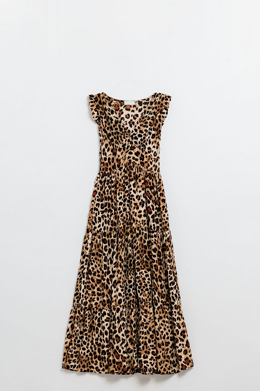 Robe d'été longue et soyeuse en imprimé léopard tendance avec mini-manches volantées et décolleté en V. Taille cintrée flatteuse avec élastique au dos. Coupe trapèze et jupe romantique à volants.