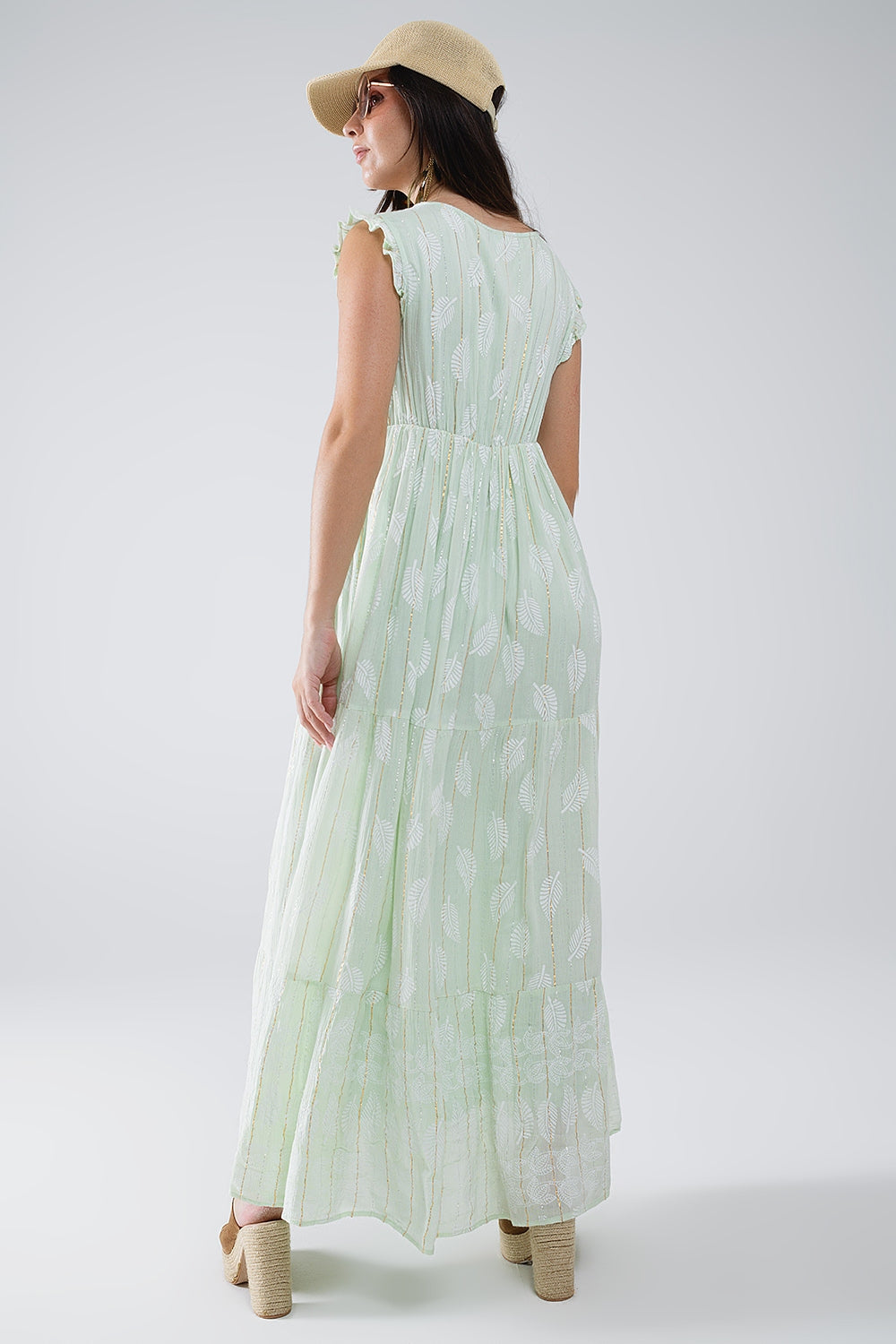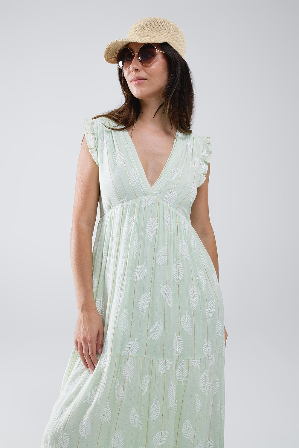 Robe longue babydoll boho à imprimé feuilles et lurex en menthe